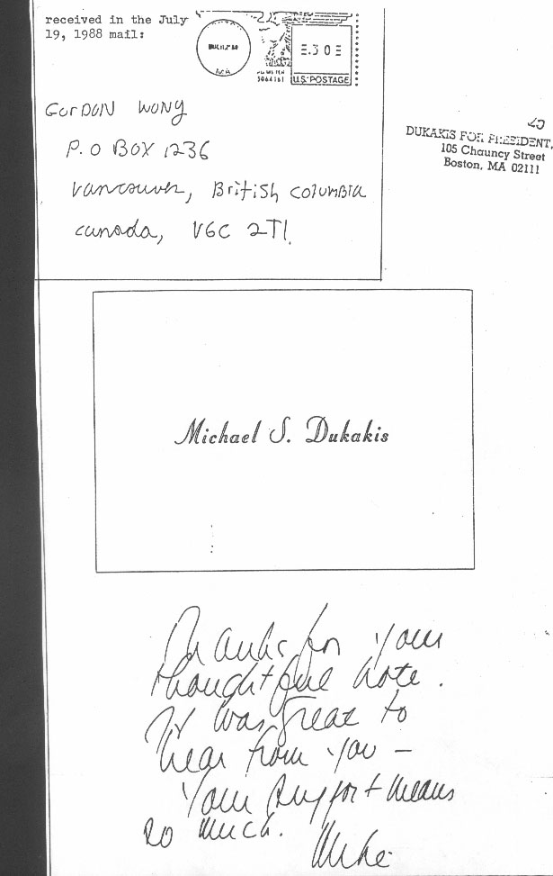 -THE STORY BEHIND RECEIPT OF THIS IS THAT I SENT HIM A LETTER, TELLING HIM I THOUGHT THAT THE STORY ABOUT MY "INTERNATIONAL DIPLOMATIC WORK...ON A DIRECT BASIS" FOR THE WORLD'S CHILDREN MIGHT BREAK DURING THE 1988 U.S. PRESIDENTIAL CAMPAIGN. I TOLD HIM TO CONTACT TEDDY KENNEDY TO GET A BRIEFING ABOUT IT.