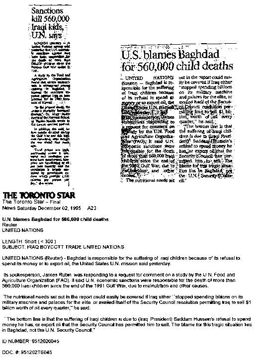 THAT WOULD BE THE REPORT, AS I EXPLAINED TO MR. EKEUS’ OFFICE, THAT CBC ‘NEWSWORLD’ WAS REPORTING THEN STATED THAT IRAQ HAD OR HAS “ENOUGH BIOLOGICAL WEAPONS TO KILL EVERYONE ON EARTH.”