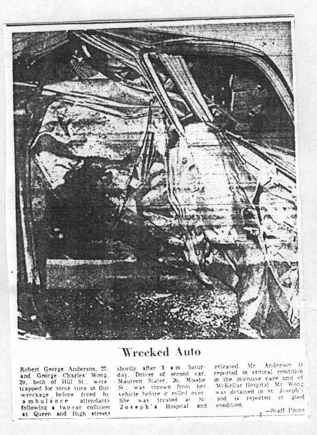Robert George Anderson, 27, and George Charles Wong, 20, both of Hill St., were trapped for some time in this wreckage before freed by ambulance attendants following a two-car collision at Queen and High streets shortly after 3 a.m. Saturday. Driver of second car, Maureen Slater, 20, Moodie St., was thrown from her vehicle before it rolled over. She was treated at St. Joseph's Hospital and released. Mr. Anderson is reported in critical condition in the intensive care unit of McKellar Hospital. Mr. Wong was detained in St. Joseph's and is reported in good condition.