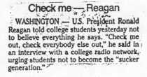 WASHINGTON-U.S. President Ronald Reagan told college students yesterday not to believeeverything he says. "Check me out, check everybody out," he said in an interview witha college radio network, urging students not to become the "sucker generation."
