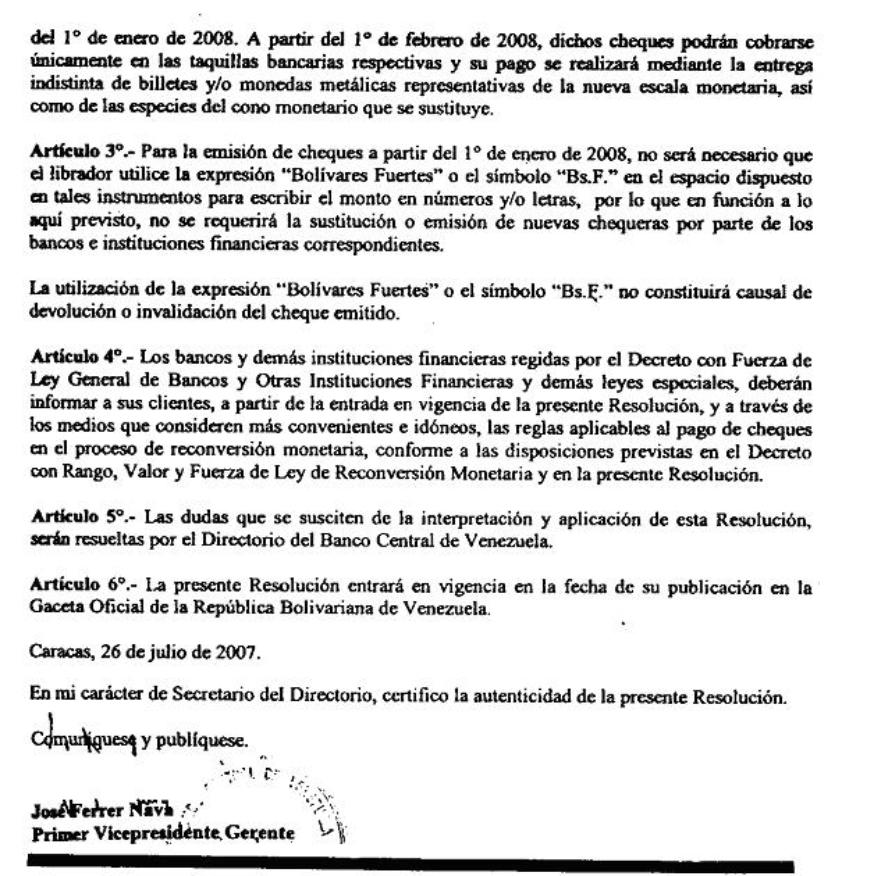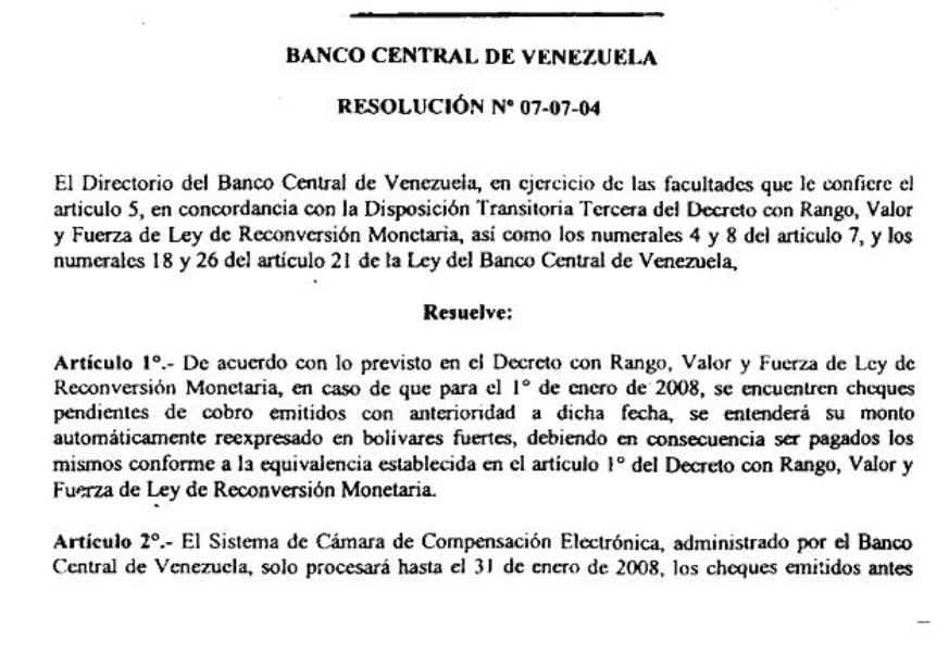 Banco Central de Venezuela, Resolución por la cual se dispone que para el 1ro. de Enero de 2008, en caso de que se